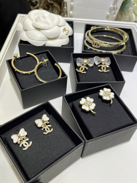 Chanel white glitter enamel bow gold full diamond double C earrings-3745