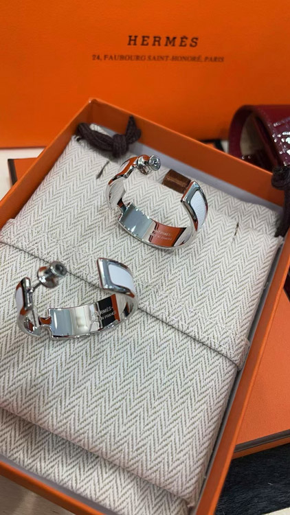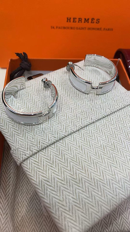 Hermès metal H letter white leather earrings-3714